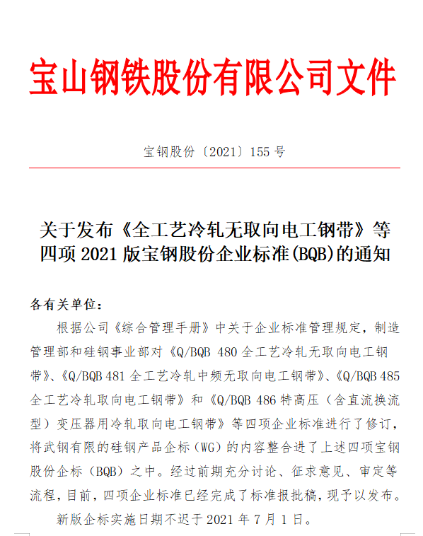 2021年4月28日,由股份制造管理部和硅钢事业部牵头修订的四项硅钢系列企业标准正式发布,并将于7月1日起实施。